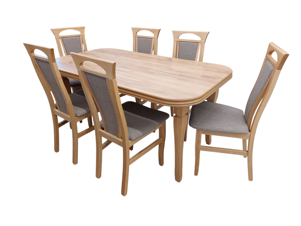 Cena przykładowego zestawu ze stołem z blatem laminat o wymiarach 140x80+2x40 (220cm po rozłożeniu) z 6 krzesłami - 1990zł.