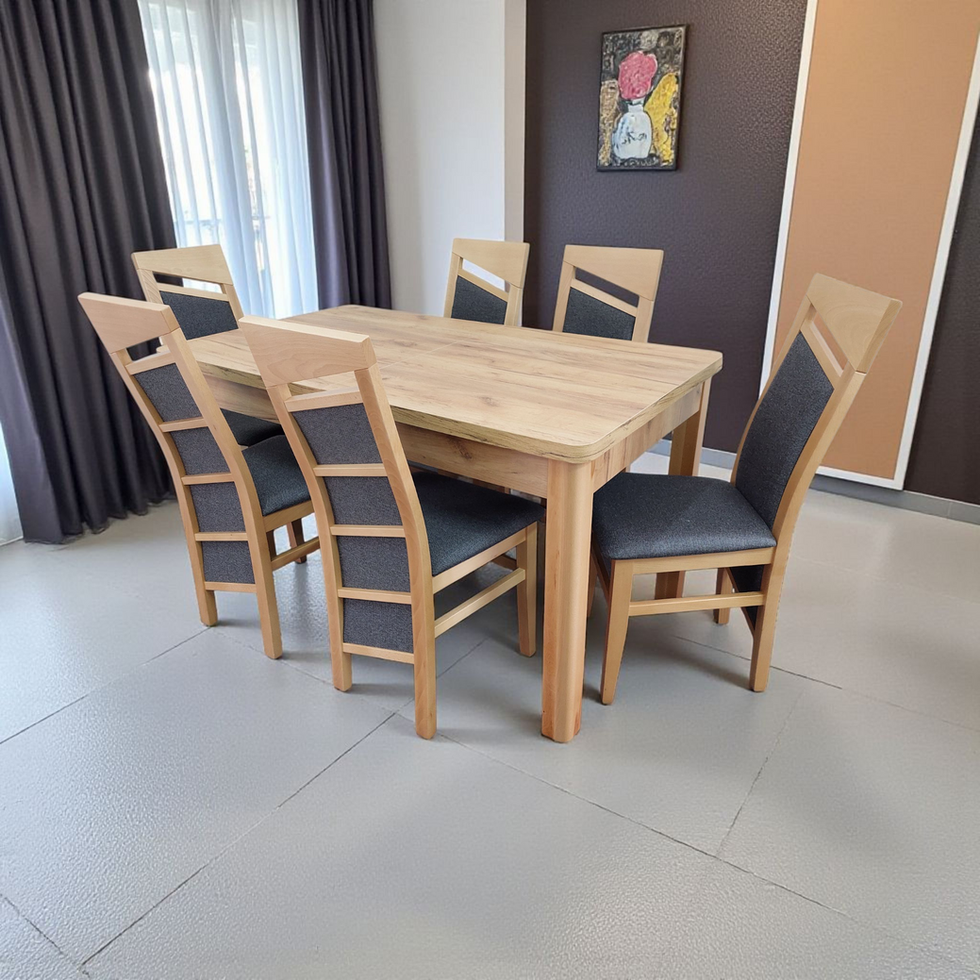 Cena przykładowego zestawu ze stołem z blatem laminat o wymiarach 140x80+40 (180cm po rozłożeniu) z 6 krzesłami - 2190zł.